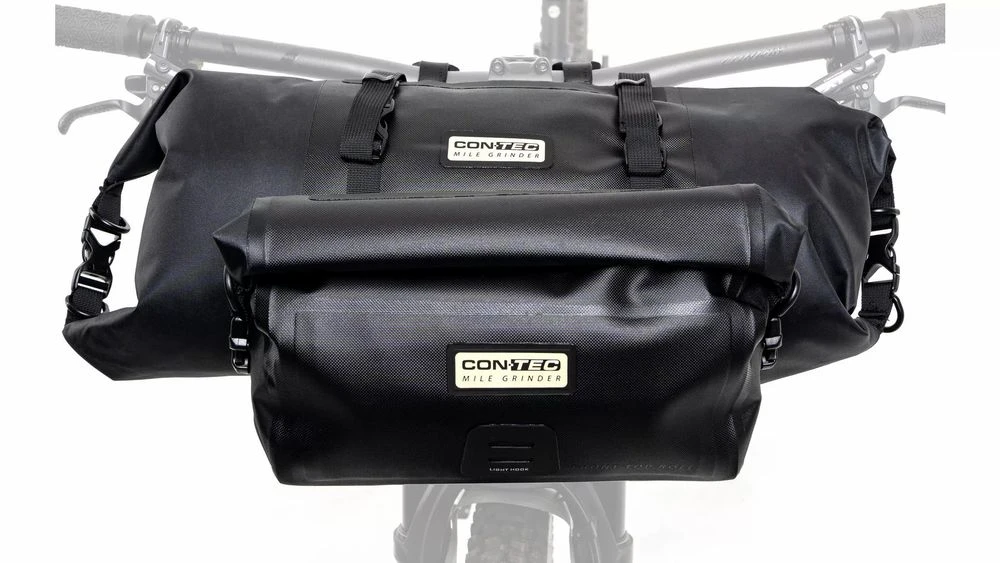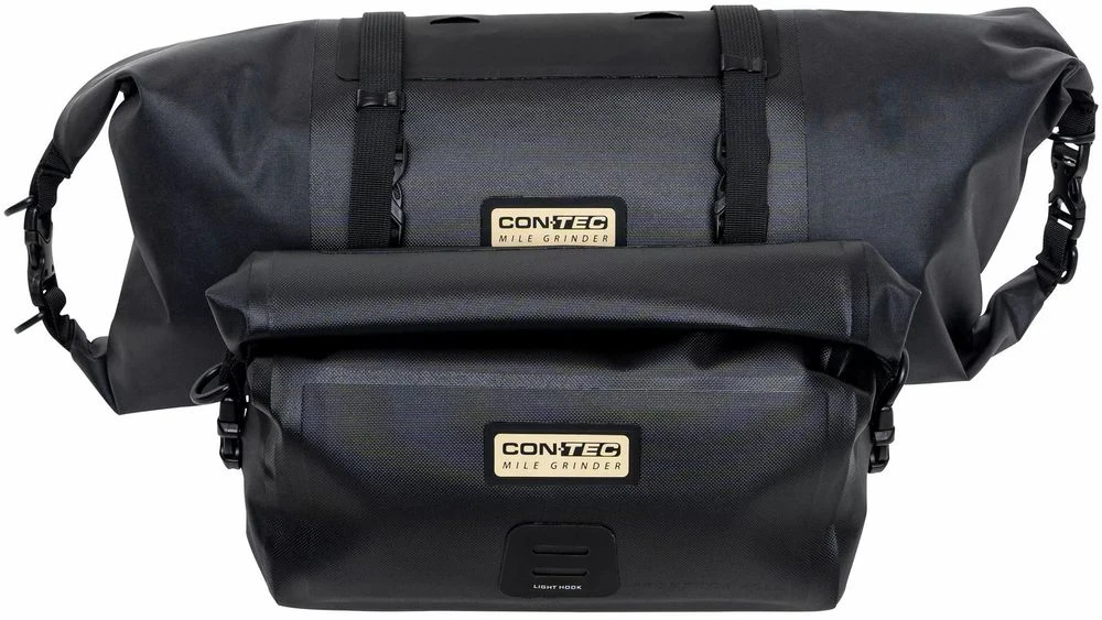 Du brennst für Bikepacking oder willst es einfach mal ausprobieren, aber dir fehlen noch die passenden Taschen? Das „Mile Grinder Front“ Lenkertaschen-Set von CONTEC kommt da gerade Recht, vor allem, wenn du dir noch unsicher bist, wie große Taschen du tatsächlich benötigst. Das Set besteht nämlich aus zwei unterschiedlich großen Taschen, die du entweder beide am Lenker befestigen kannst oder je nach Bedarf die größere (8 Liter) oder die kleinere (4 Liter) einzeln. Das funktioniert spielend leicht über die mitgelieferten Riemen.