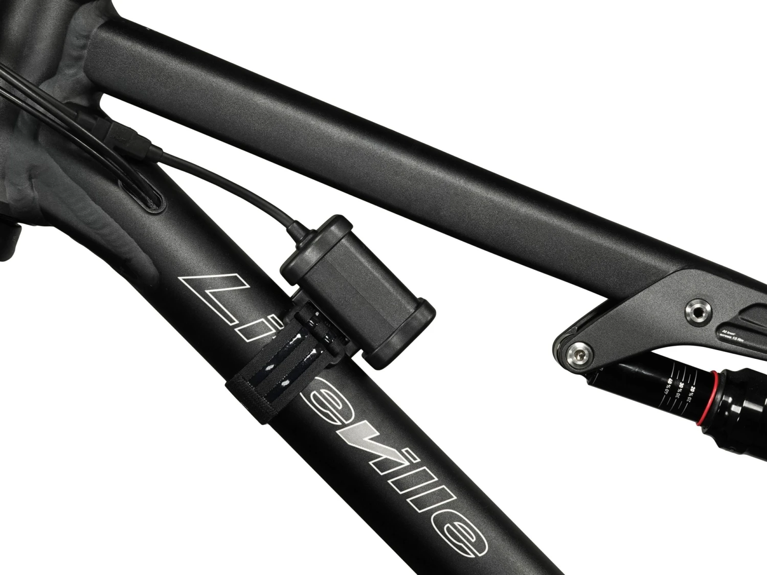 beiliegenden beschichteten Klettband am Ober- oder Unterrohr des Rahmens befestigt. Die Lampe schaltet bei