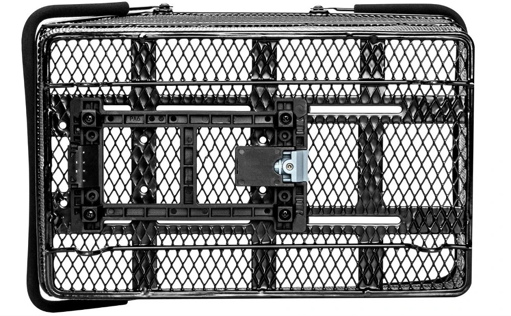 Engmaschig, Stahl, Tragegriffe mit Soft Grip, mit Reflex-Logo, vorne abgeschrägt, Montage in Fahrtrichtung, Standfüße, inkl. MIK-Systemadapterplatte