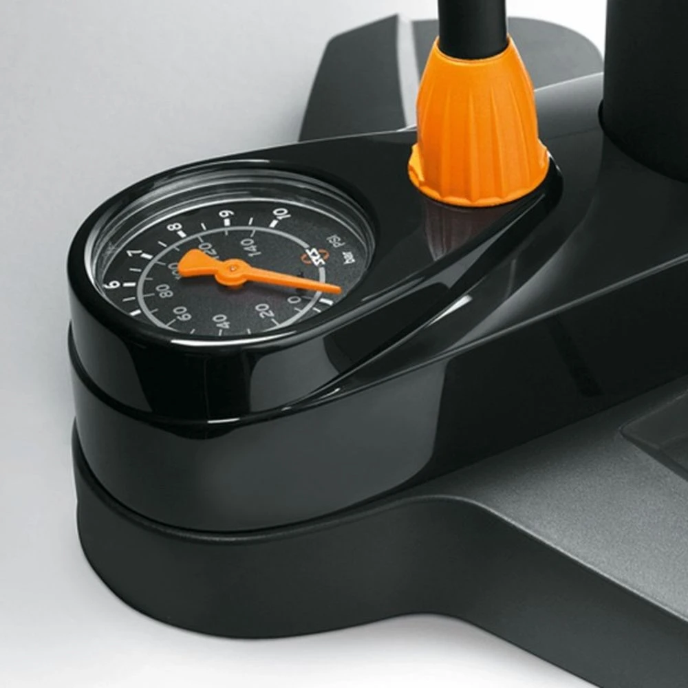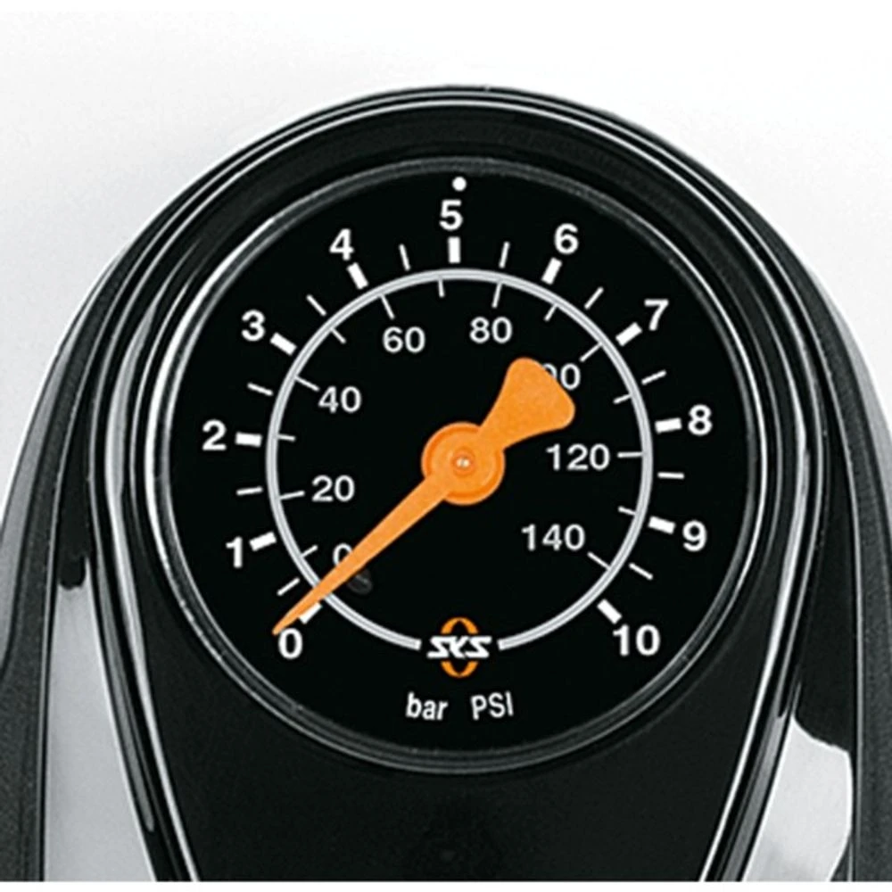 Der Druck wird in bar und psi angezeigt. Durch den bewährten SKS MULTI VALVE-Pumpenknopf mit Klemmhebel ist sie sehr einfach in der Handhabung.