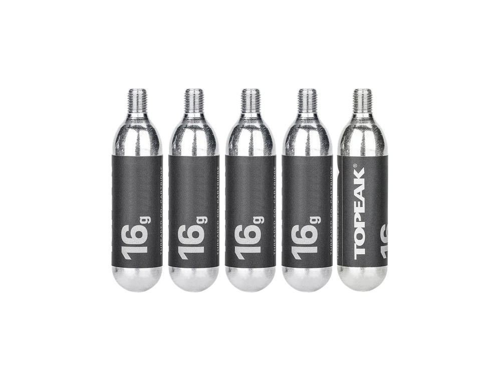 16 g CO₂-Gewindekartuschen (5er Set). Für Topeak Hybrid Rockets, AirBooster und Micro AirBooster, Airbooster Race Pod X, Ninja CO2+, Ninja CO2. Optimal geeignet für 29″ Bereifung.