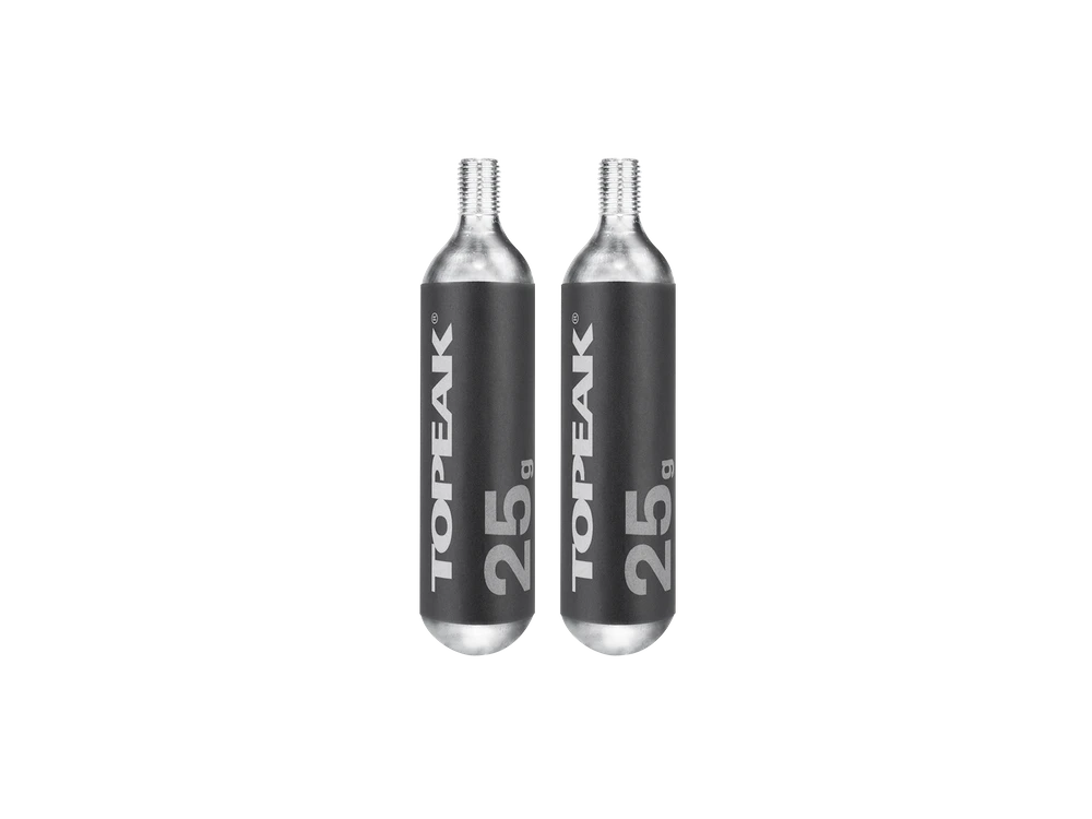 25 g CO₂-Gewindekartuschen (2 Stück). Für Topeak HybridRocket MT, AirBooster und Micro AirBooster. Optimal geeignet für 29″ Bereifung.